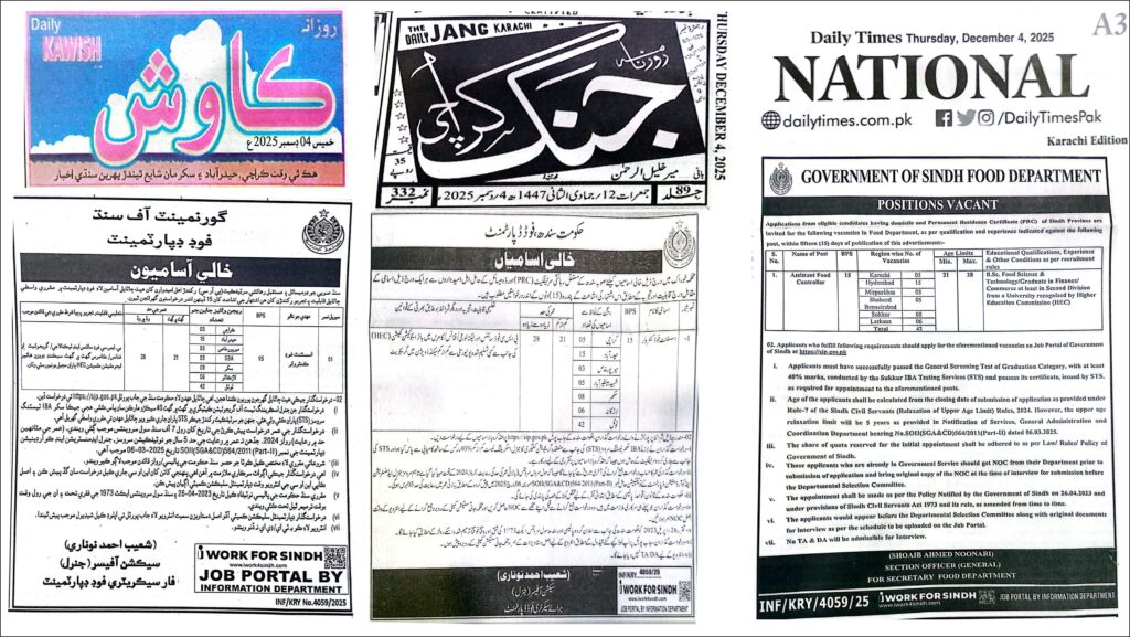 Sindh Food Department Assistant Food Controller & Junior Clerk Jobs 2025 Latest Advertisement